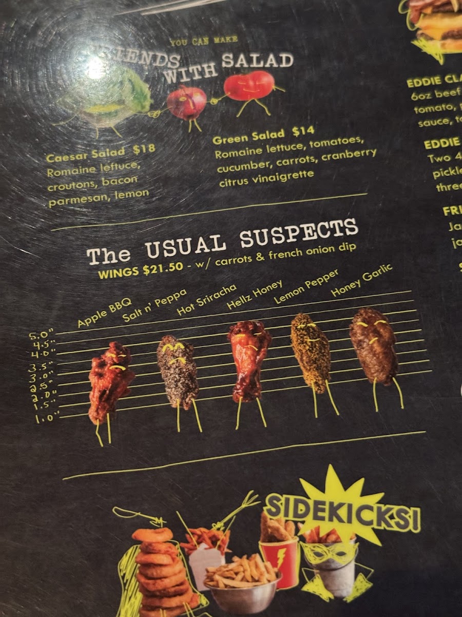 The menu features a variety of burgers ranging from classic options like the Eddie Classic to more adventurous choices such as the Bison Burger Stacked or the Rocky Mountain Burger served with deep-fried pickles. Alongside these, you’ll find comforting sides like crispy poutine, onion rings, and truffle fries, all perfect for sharing or pairing with your meal. Fans of richer, indulgent flavors will appreciate selections like the Apple Barbecue Chicken Wings or the fried buttermilk chicken burger.