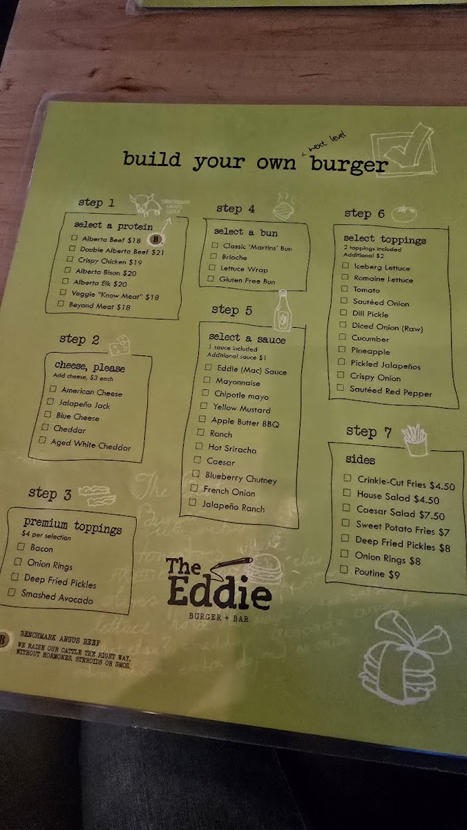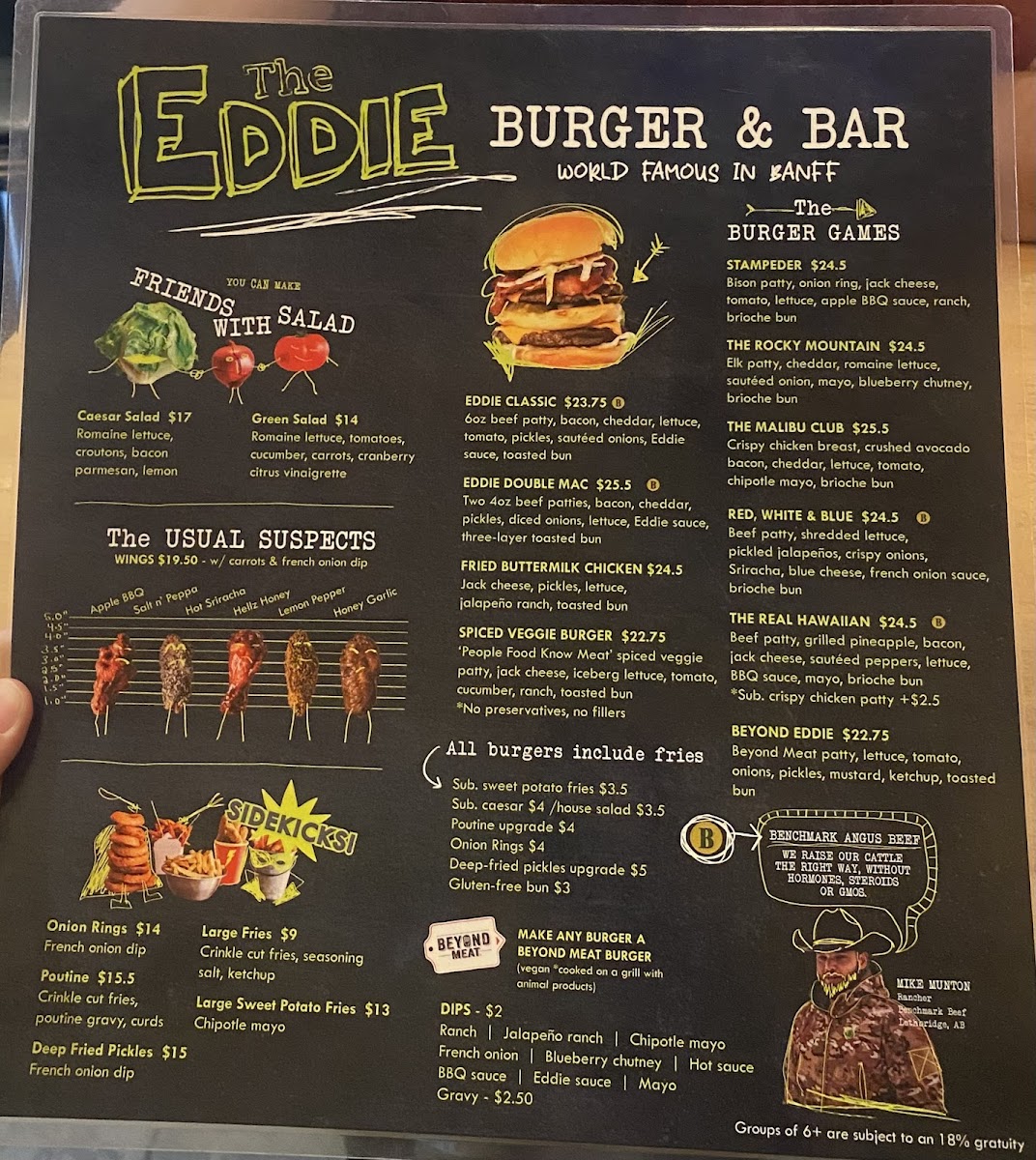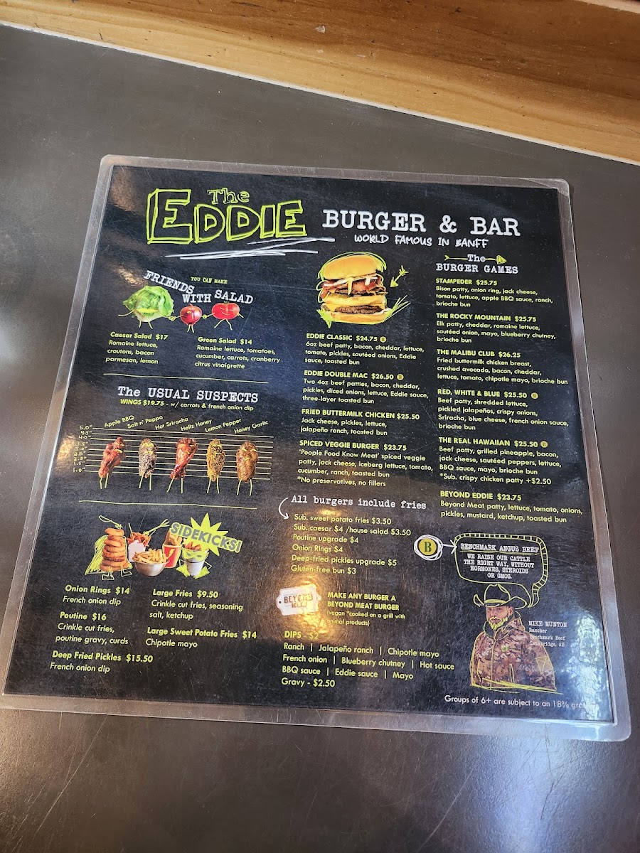 The Eddie Burger + Bar offers a straightforward, satisfying menu centered around hearty American comfort food with a casual, pub-style vibe. The focus is clearly on well-crafted burgers and familiar sides, making it a go-to spot for relaxed meals that fit seamlessly into a lively Banff atmosphere.